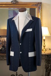 仮縫いとは、本縫いに入る前にスーツの形に仮に縫い合わせたものを使って、途中段階でお客様のお好みのサイズ感や体型的な補正の確認を行う作業です。